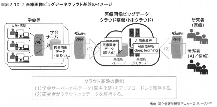 本センターを基盤として、NIIが構築・運用する学術情報ネットワーク「SINET5」※118を活用した医療画像ビッグデータのクラウド基盤の構築、AIによる医療画像解析の研究開発、匿名化した医療画像の収集に学会※119の協力を得つつ取り組むとしている(図2-10-2)。